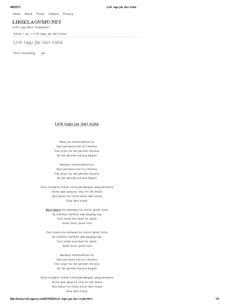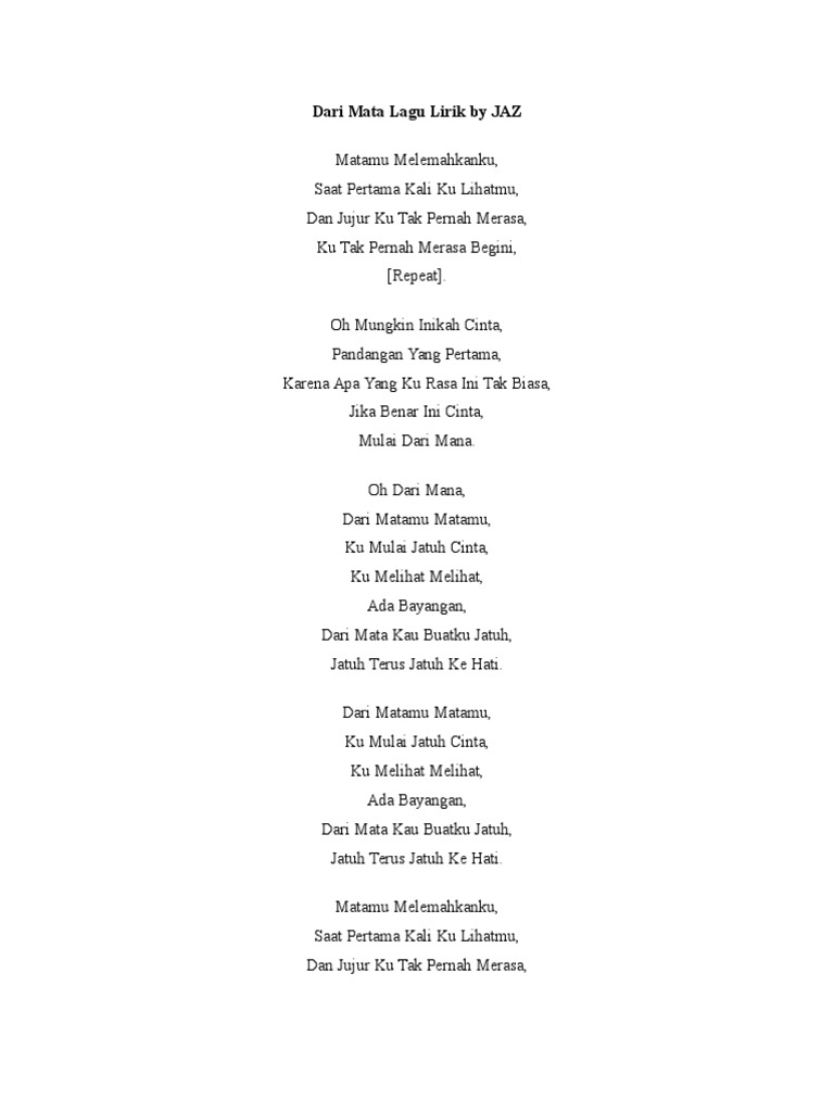 Lirik Lagu dari Jaz Dari Mata. Lirik Lagu Dari Mata Jaz. Matamu Melemahkanku Saat Pertama Kali Ku Lihatmu Dan Jujur Ku Tak Pernah Merasa Ku Tak Pernah Merasa Begini Oh Mungkin Inikah Cinta Pandangan Yang Pertama Karena Apa Yang Ku Rasa Ini Tak Biasa Jika Benar Ini Cinta.